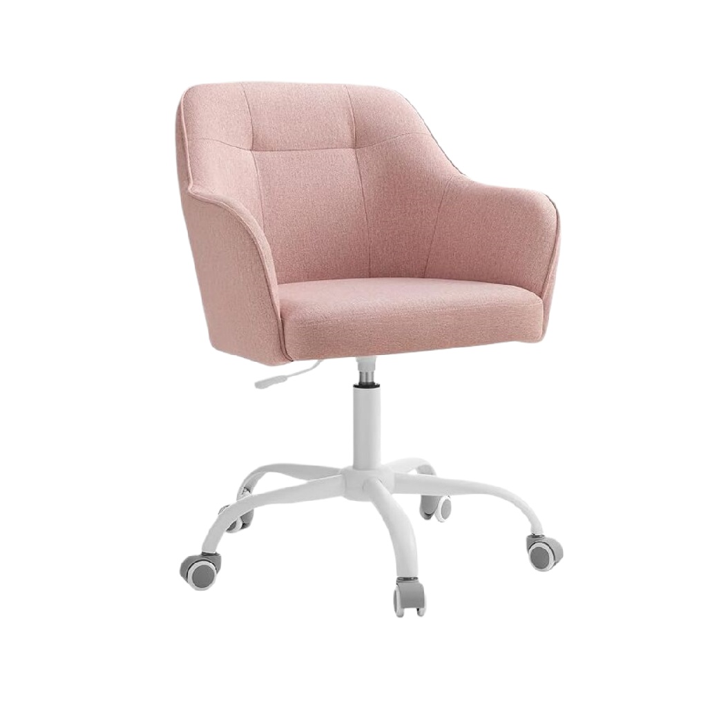 **Chaise de bureau pivotante moderne en tissu rose avec base blanche**