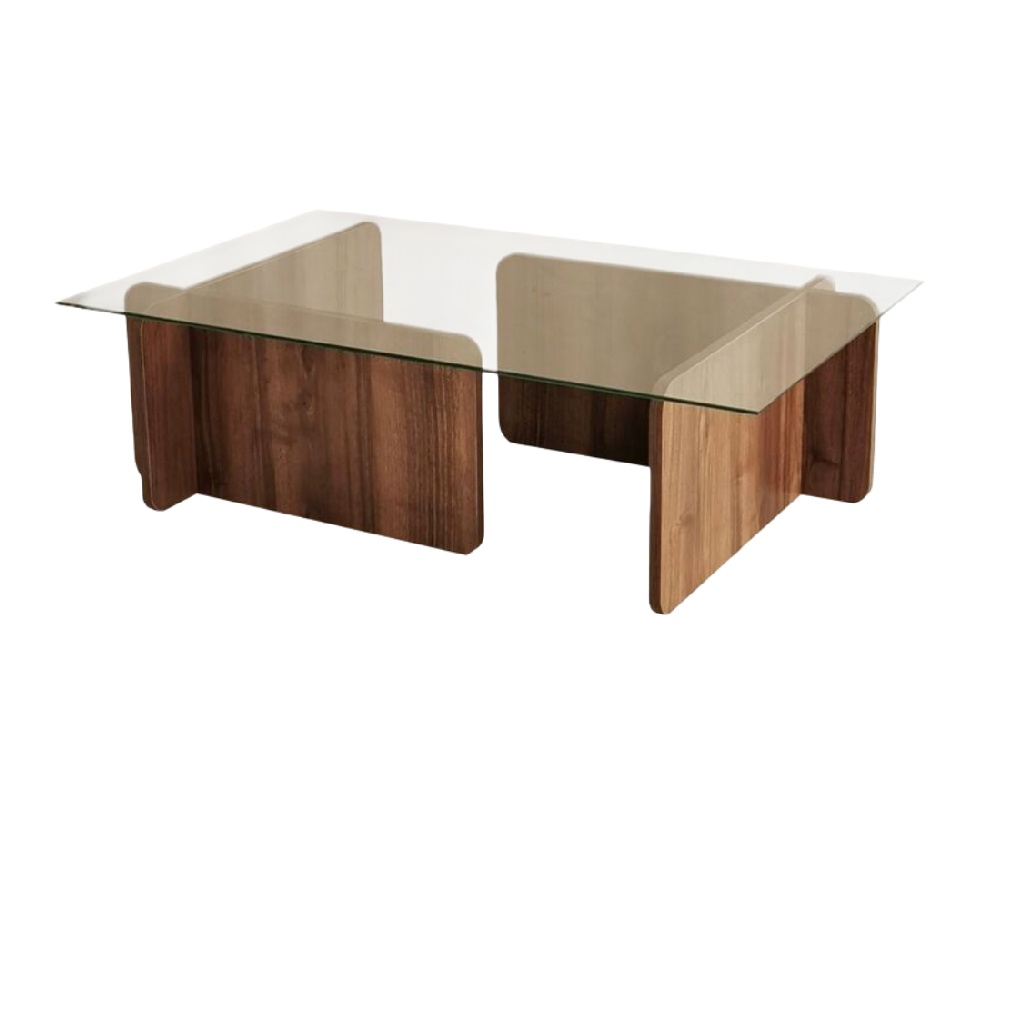 Table basse en bois avec plateau en verre transparent.