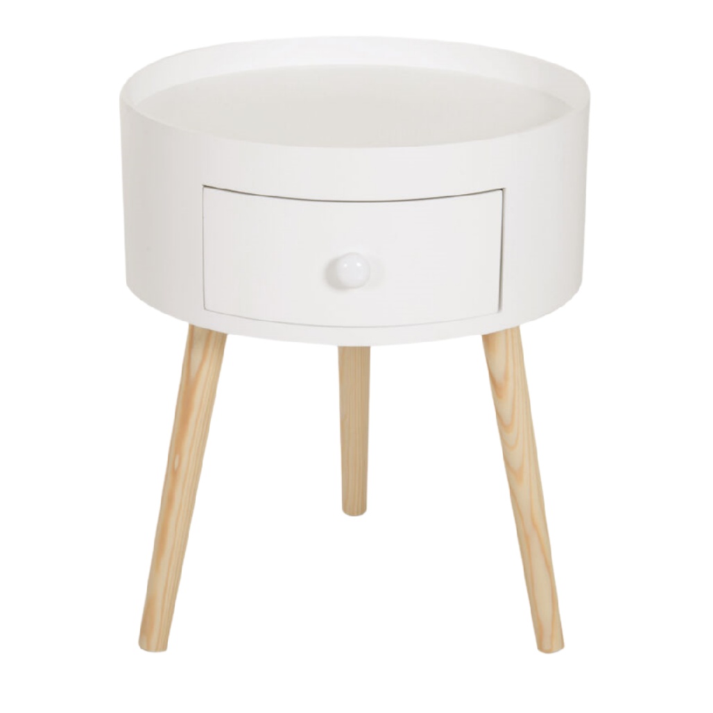 Table de chevet blanche avec tiroir et pieds en bois naturel.